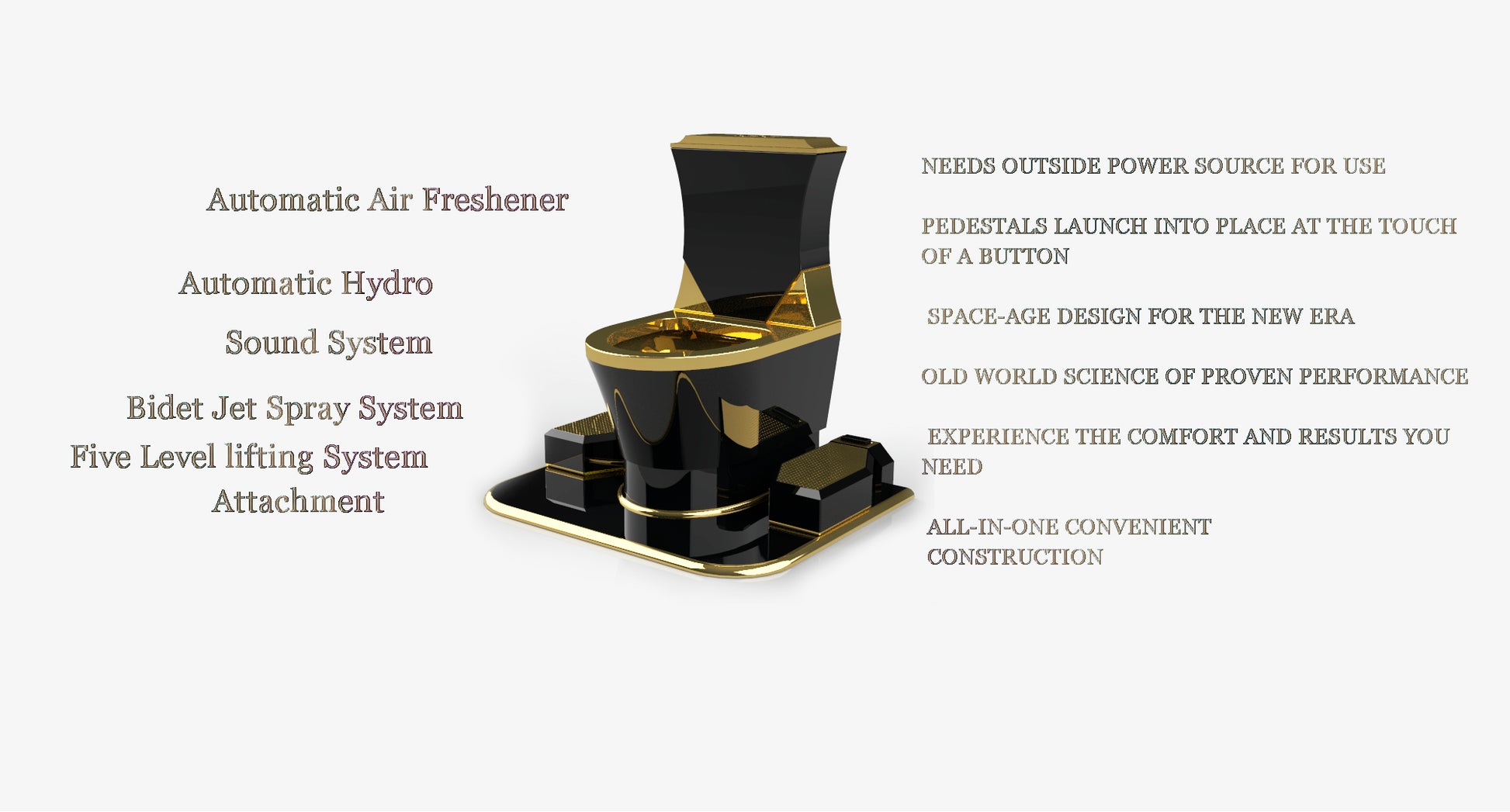 Our toilets elevate the feet of people off of the floor to re-create the “Squatting” posture WHICH HAS BEEN THE MOST EFFICIENT POSTURE FOR THE SPINE SINCE THE BEGINNING OF TIME – Once you experience the difference this makes you will not settle for less. Our toilets not only come equipped from the factory with pedestals to elevate the feet – the pedestals adjust to {5} different levels to arrive at the most comfortable and efficient position for your posture. In addition, the toilet bowls as well also adjust to different levels to satisfy the most demanding of bodily functions – for your comfort.