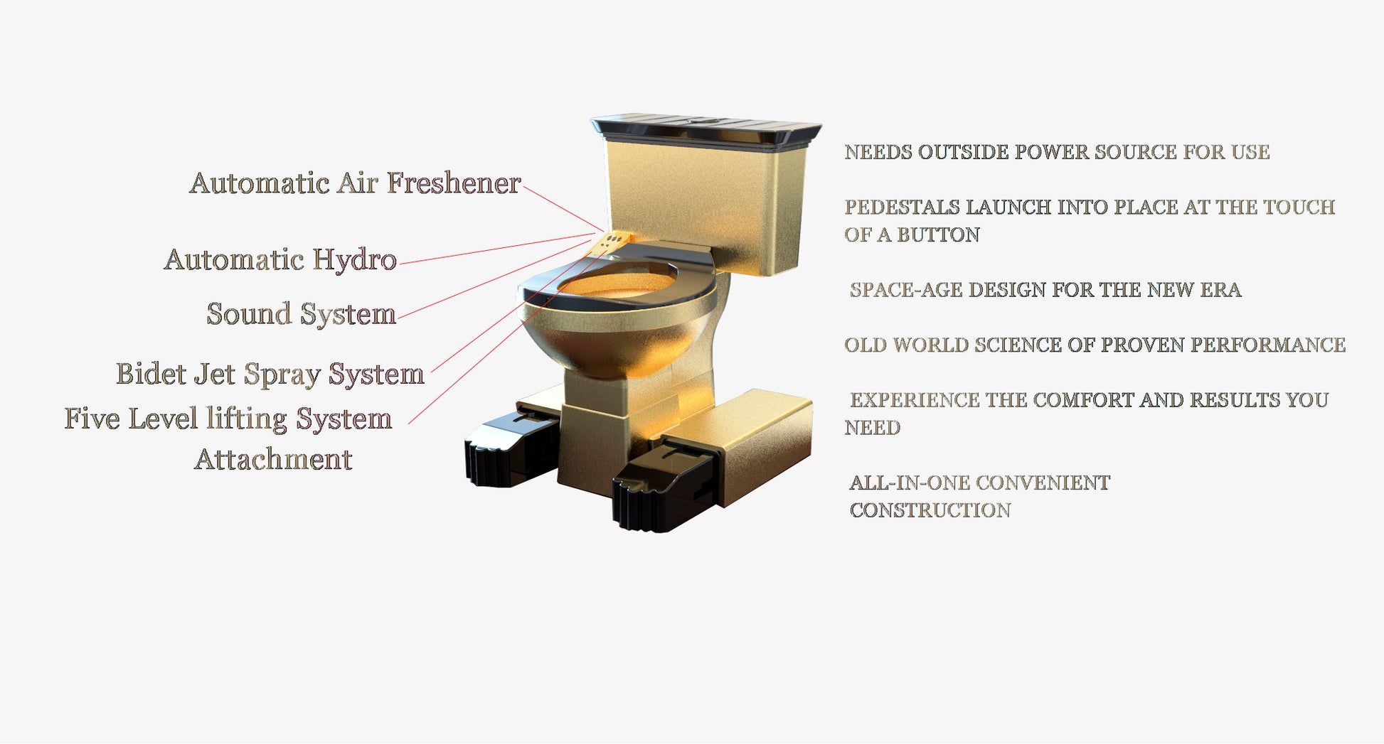 Our toilets elevate the feet of people off of the floor to re-create the “Squatting” posture WHICH HAS BEEN THE MOST EFFICIENT POSTURE FOR THE SPINE SINCE THE BEGINNING OF TIME – Once you experience the difference this makes you will not settle for less. Our toilets not only come equipped from the factory with pedestals to elevate the feet – the pedestals adjust to {5} different levels to arrive at the most comfortable and efficient position for your posture. In addition, the toilet bowls as well also adjust to different levels to satisfy the most demanding of bodily functions – for your comfort.